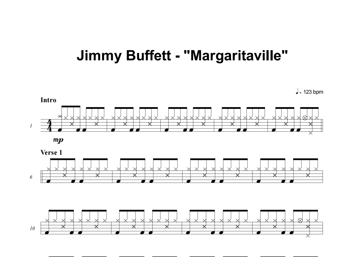 《Margaritaville》是Jimmy Buffett演唱的一首歌曲,这份架子鼓谱共有四张高清图谱,图谱由 @失眠的土豆 编配上传,图谱使用五线谱编配,使用这份Margaritaville架子鼓谱,你将能够轻松地敲打出这首Jimmy Buffett的Margaritaville,快来尝试吧。