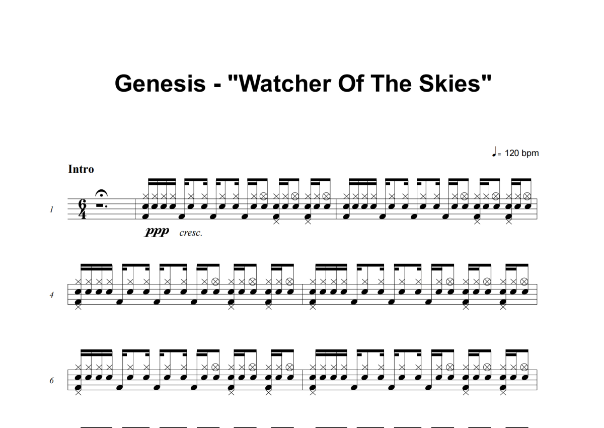 《Watcher Of The Skies》是Genesis演唱的一首歌曲,这份架子鼓谱共有七张高清图谱,图谱由 @失眠的土豆 编配上传,图谱使用五线谱编配,使用这份Watcher Of The Skies架子鼓谱,你将能够轻松地敲打出这首Genesis的Watcher Of The Skies,快来尝试吧。