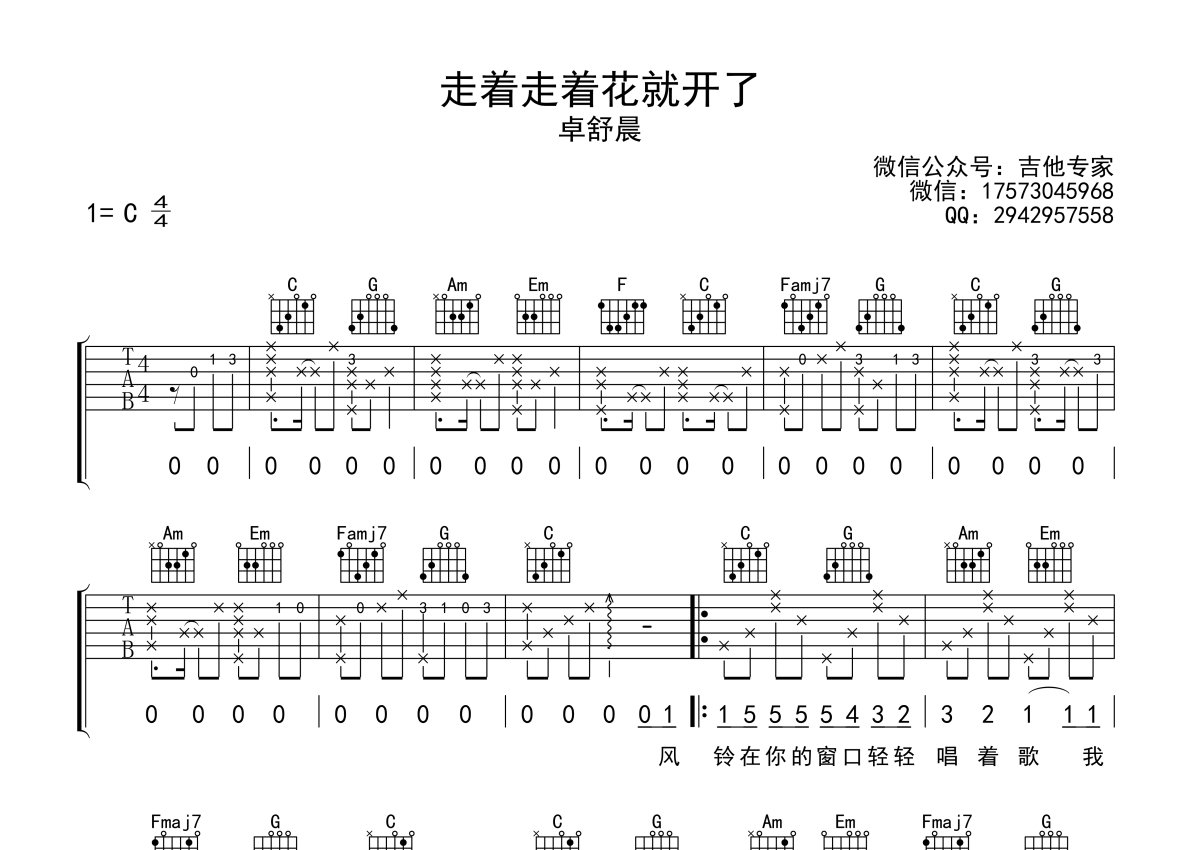 卓舒晨《走着走着花就开了》吉他谱 - C调弹唱六线谱