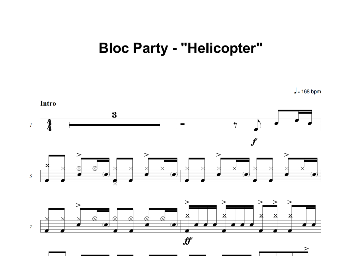 《Helicopter》是Bloc Party演唱的一首歌曲,这份架子鼓谱共有七张高清图谱,图谱由 @失眠的土豆 编配上传,图谱使用五线谱编配,使用这份Helicopter架子鼓谱,你将能够轻松地敲打出这首Bloc Party的Helicopter,快来尝试吧。