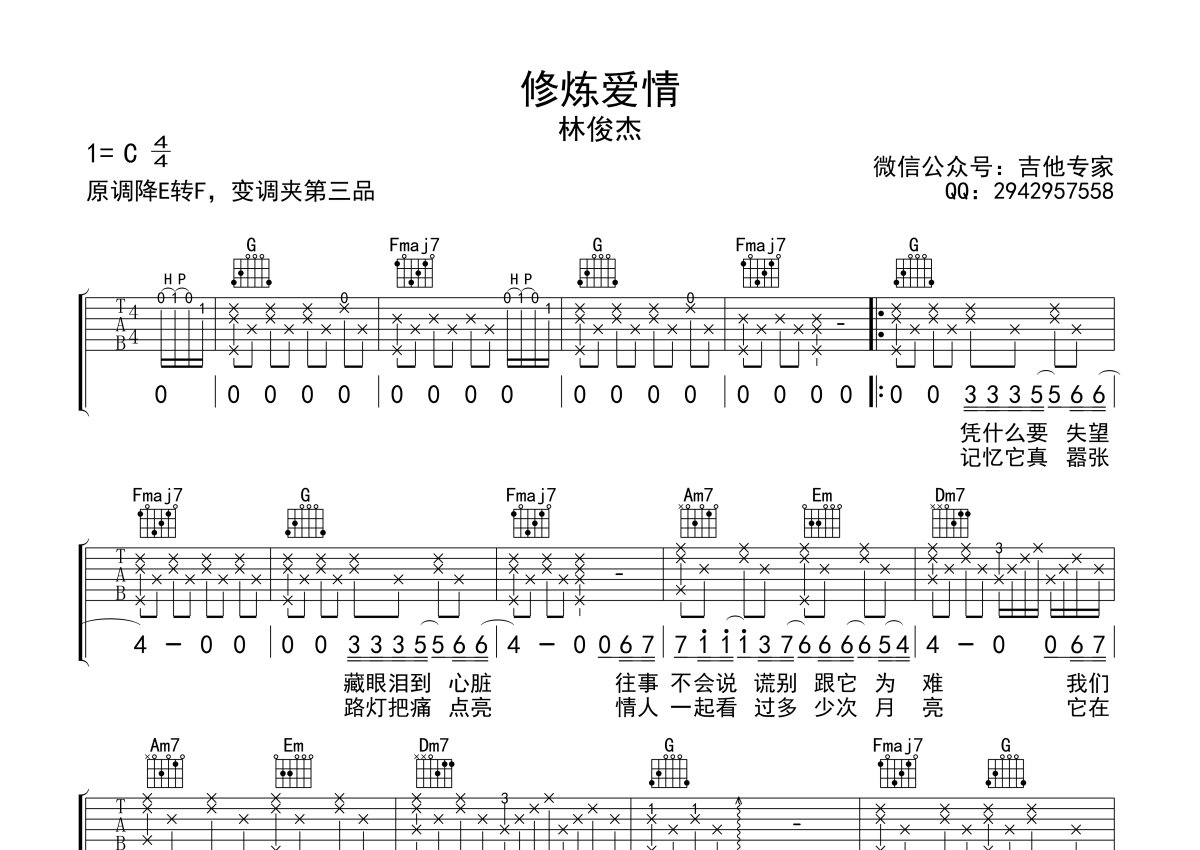 《修炼爱情》是林俊杰演唱的一首歌曲,本吉他谱采用的是C调指法编配,这份吉他谱共有两张高清图谱,图谱由 @吉他专家 编配上传,图谱使用六线谱编配,包含吉他和弦指法、简谱以及歌词部分,使用这份修炼爱情吉他谱,可以让你更加方便地掌握这首歌曲的弹唱技巧,快来尝试吧。