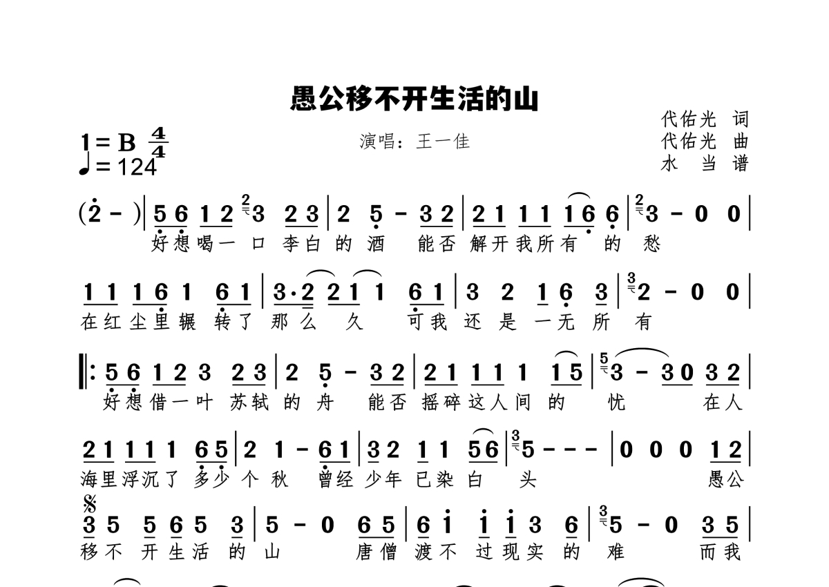 《愚公移不开生活的山》是王一佳演唱的一首歌曲,拍号为4/4拍,歌曲速度为每分钟124拍,这份简谱共有一张高清图谱,图谱由 @水当 编配上传原调B。