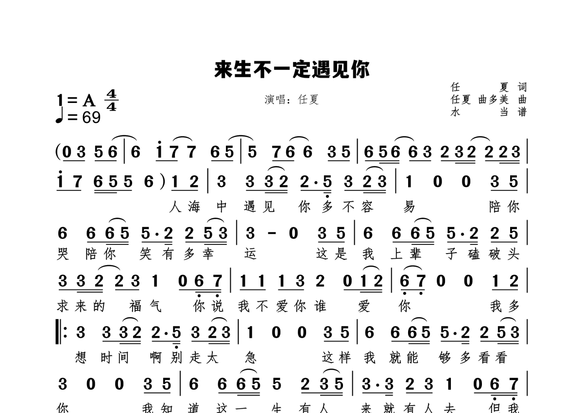 《来生不一定遇见你》是任夏演唱的一首歌曲,拍号为4/4拍,歌曲速度为每分钟69拍,这份简谱共有一张高清图谱,图谱由 @水当 编配上传原调A。