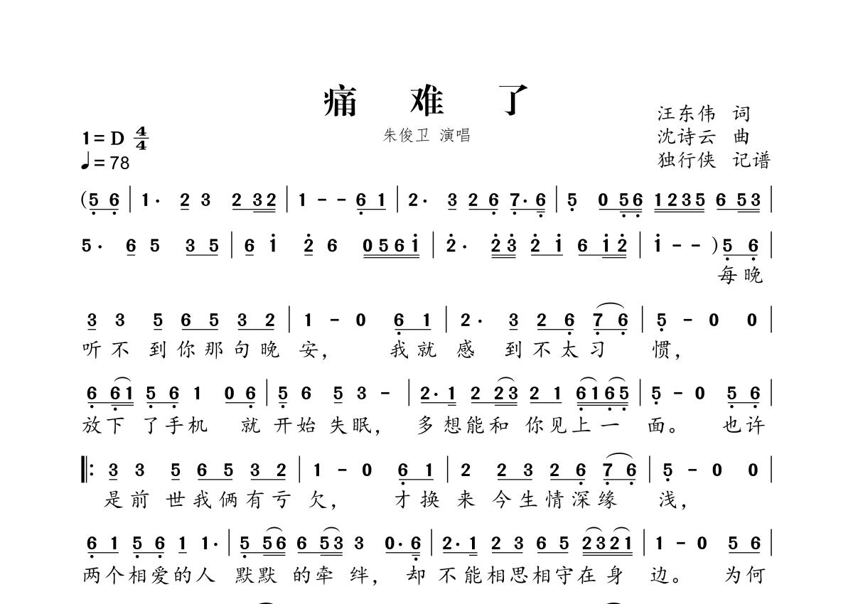 《痛难了》是朱俊卫演唱的一首歌曲,拍号为4/4拍,歌曲速度为每分钟76拍,这份简谱共有一张高清图谱,图谱由 @独行侠 编配上传。