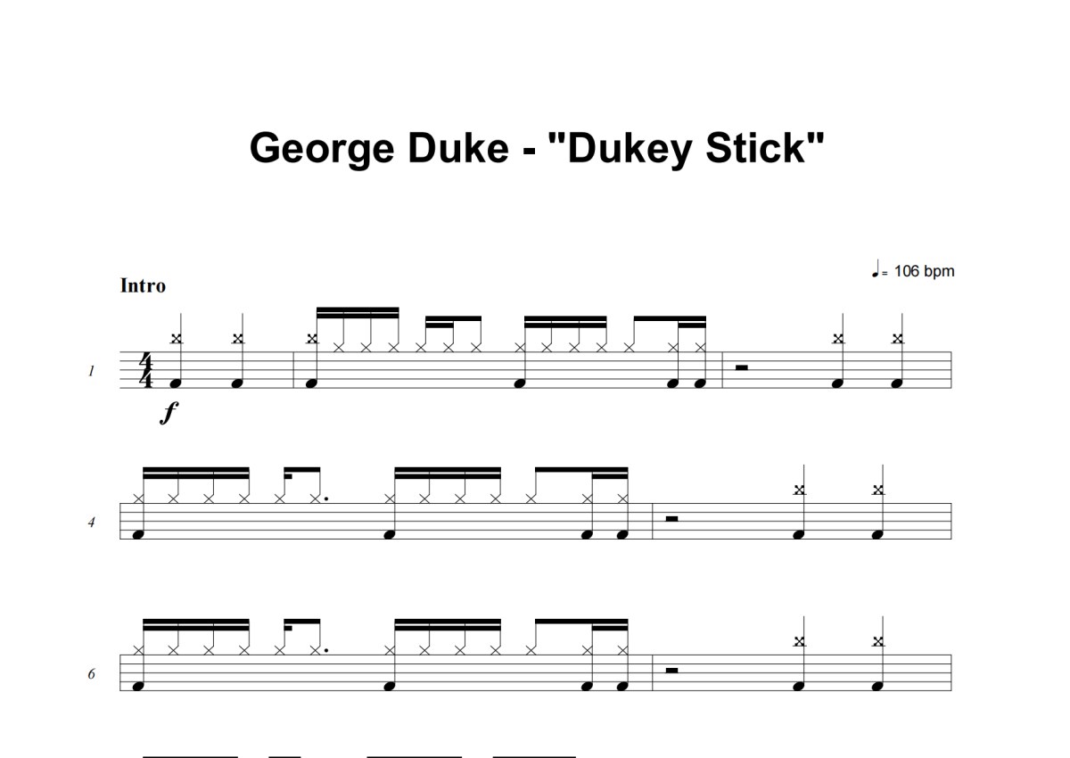 《Dukey Stick》是George Duke演唱的一首歌曲,这份架子鼓谱共有八张高清图谱,图谱由 @失眠的土豆 编配上传,图谱使用五线谱编配,使用这份Dukey Stick架子鼓谱,你将能够轻松地敲打出这首George Duke的Dukey Stick,快来尝试吧。