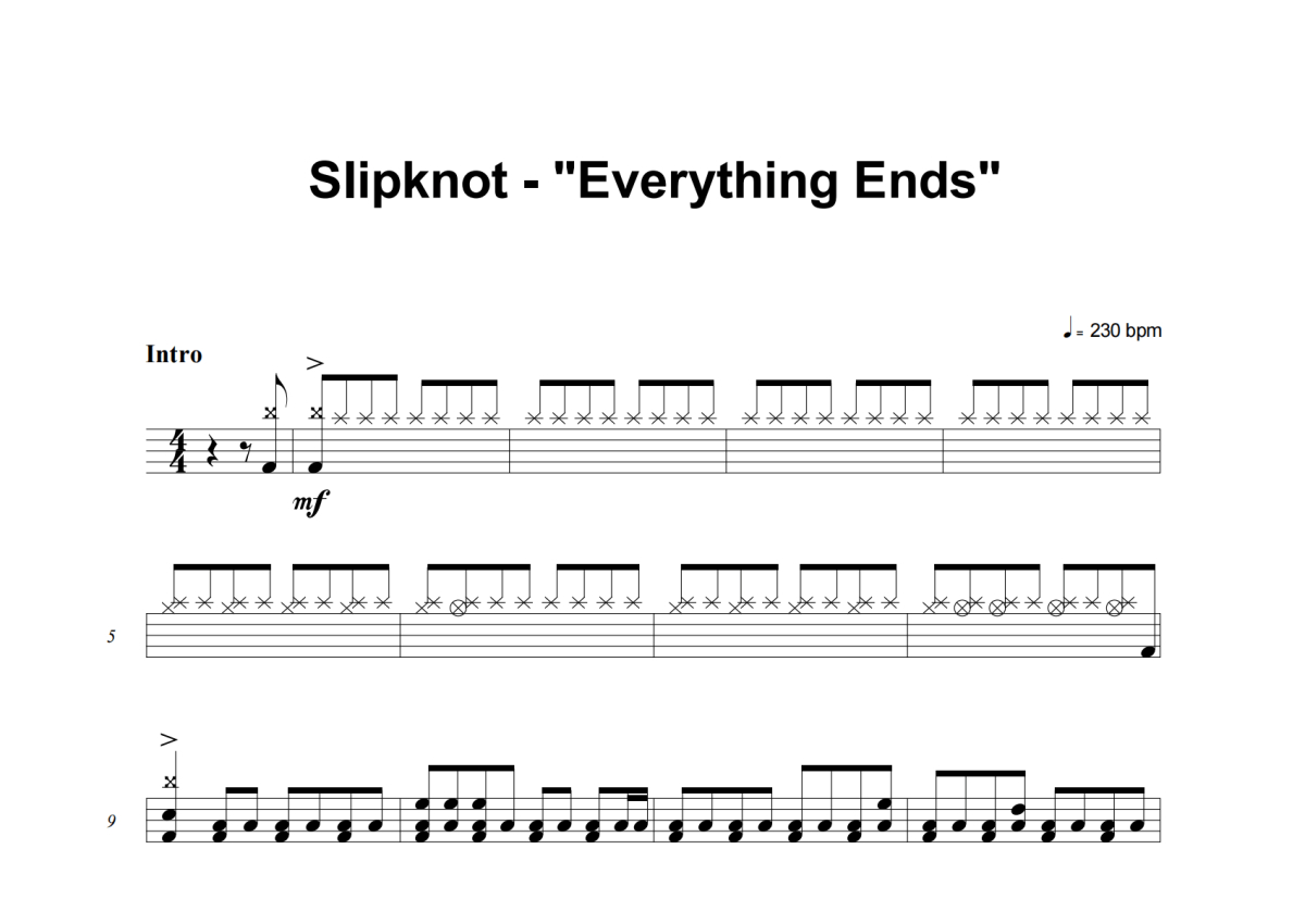 《Everything Ends》是Slipknot演唱的一首歌曲,这份架子鼓谱共有七张高清图谱,图谱由 @失眠的土豆 编配上传,图谱使用五线谱编配,使用这份Everything Ends架子鼓谱,你将能够轻松地敲打出这首Slipknot的Everything Ends,快来尝试吧。
