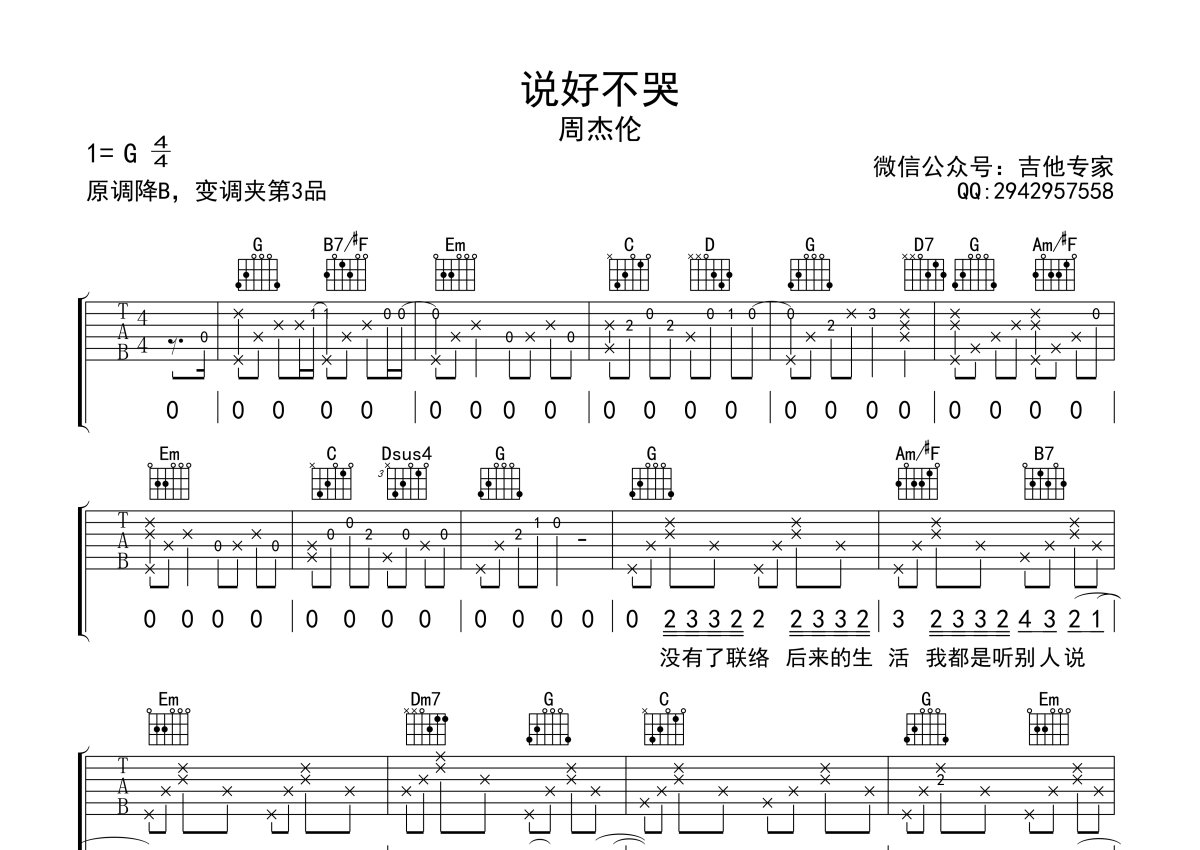 周杰伦《说好不哭》吉他谱 - G调弹唱六线谱