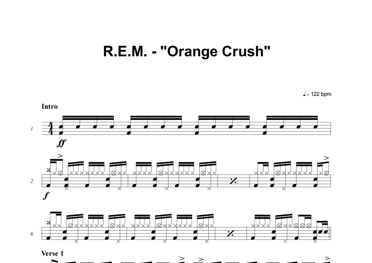 《Orange Crush》是R.E.M.演唱的一首歌曲,这份架子鼓谱共有四张高清图谱,图谱由 @失眠的土豆 编配上传,图谱使用五线谱编配,使用这份Orange Crush架子鼓谱,你将能够轻松地敲打出这首R.E.M.的Orange Crush,快来尝试吧。