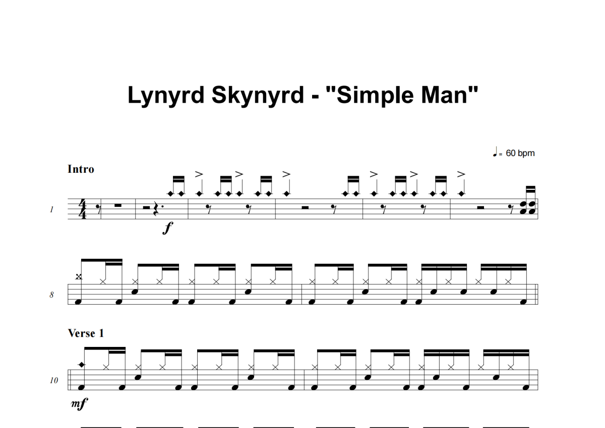 《Simple Man》是Lynyrd Skynyrd演唱的一首歌曲,这份架子鼓谱共有五张高清图谱,图谱由 @失眠的土豆 编配上传,图谱使用五线谱编配,使用这份Simple Man架子鼓谱,你将能够轻松地敲打出这首Lynyrd Skynyrd的Simple Man,快来尝试吧。