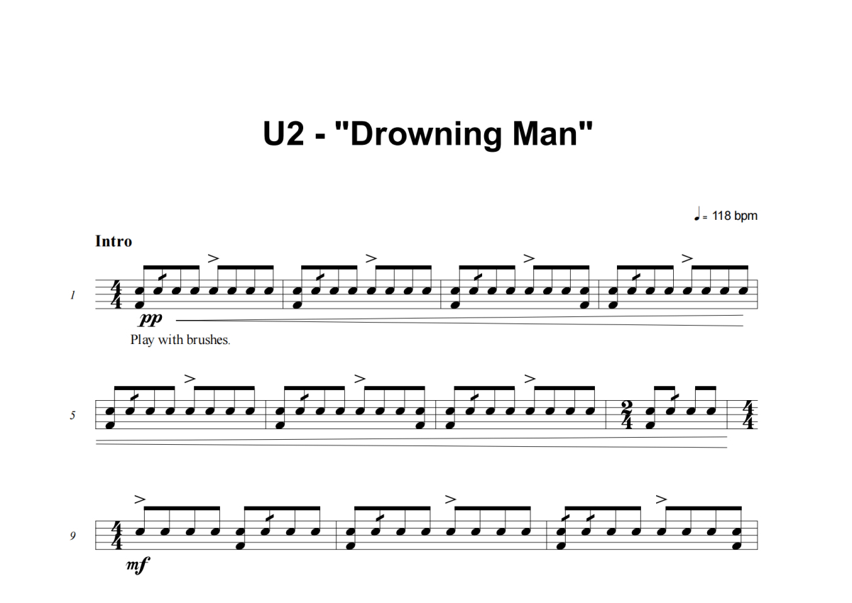 《Drowning Man》是U2演唱的一首歌曲,这份架子鼓谱共有四张高清图谱,图谱由 @失眠的土豆 编配上传,图谱使用五线谱编配,使用这份Drowning Man架子鼓谱,你将能够轻松地敲打出这首U2的Drowning Man,快来尝试吧。