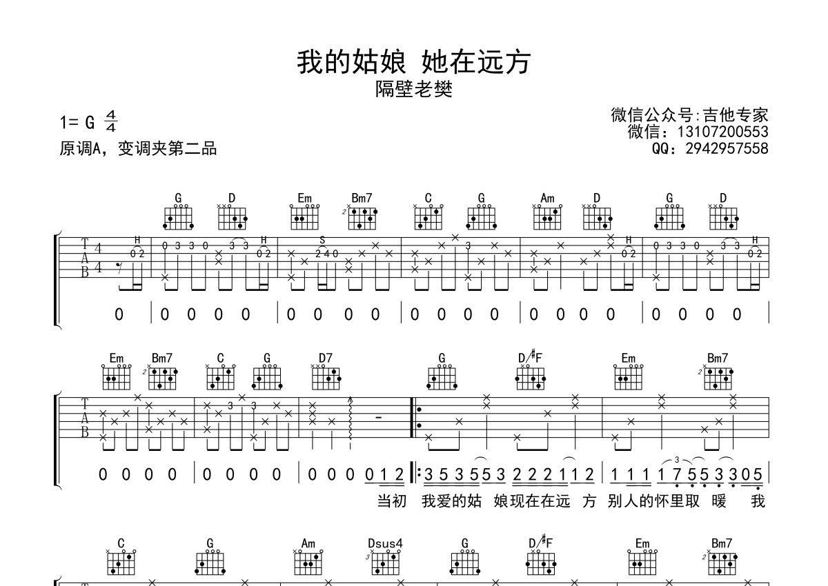 《我的姑娘她在远方》是隔壁老樊演唱的一首歌曲,本吉他谱采用的是G调指法编配,这份吉他谱共有两张高清图谱,图谱由 @吉他专家 编配上传,图谱使用六线谱编配,包含吉他和弦指法、简谱以及歌词部分,使用这份我的姑娘她在远方吉他谱,可以让你更加方便地掌握这首歌曲的弹唱技巧,快来尝试吧。《我的姑娘她在远方》吉他谱,隔壁老樊的一首新歌,原曲伴奏用的A调的指法,原版两把吉他完成的,这里选用G调指法编配在一起了,也不难,变调夹夹第二品。一首扎心情歌满是遗憾的故事,唱出对爱情的怀恋和最终的放下和祝福,让人感慨万千,但或许正是如此,我们才能真正成熟,并遇见下属于自己的爱情。愿你的姑娘,已经来到面前。