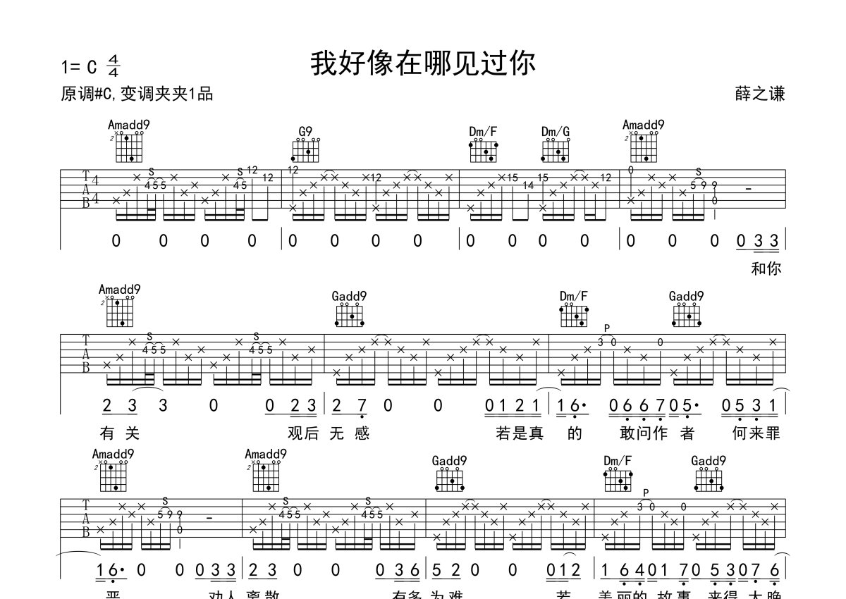 《我好像在哪见过你》是薛之谦演唱的一首歌曲,本吉他谱采用的是C调指法编配,这份吉他谱共有两张高清图谱,图谱由 @吉他专家 编配上传,图谱使用六线谱编配,包含吉他和弦指法、简谱以及歌词部分,使用这份我好像在哪见过你吉他谱,可以让你更加方便地掌握这首歌曲的弹唱技巧,快来尝试吧。我好像在哪见过你吉他谱,薛之谦演唱,动画电影精灵王座主题曲。bD调变调夹夹第二品。从灵魂深处唱出的忧伤,磁性的歌声轻易地就打动人心,或许是孤寂的默然等候,也或许是心有不甘的黯然离场。哪怕你未曾和谁有过刻骨铭心的分手,但在歌声的感情里,我们都是感同身受。