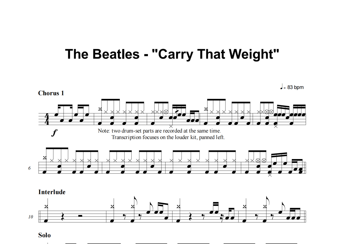《Carry That Weight》是The Beatles演唱的一首歌曲,这份架子鼓谱共有两张高清图谱,图谱由 @失眠的土豆 编配上传,图谱使用五线谱编配,使用这份Carry That Weight架子鼓谱,你将能够轻松地敲打出这首The Beatles的Carry That Weight,快来尝试吧。