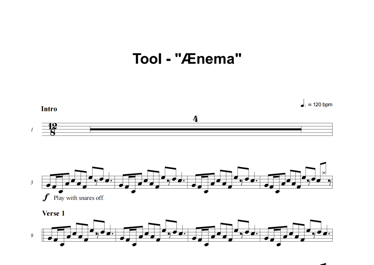 《Ænema》是Tool演唱的一首歌曲,这份架子鼓谱共有八张高清图谱,图谱由 @失眠的土豆 编配上传,图谱使用五线谱编配,使用这份Ænema架子鼓谱,你将能够轻松地敲打出这首Tool的Ænema,快来尝试吧。