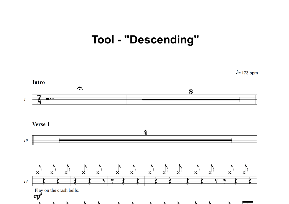 《Descending》是Tool演唱的一首歌曲,这份架子鼓谱共有十四张高清图谱,图谱由 @失眠的土豆 编配上传,图谱使用五线谱编配,使用这份Descending架子鼓谱,你将能够轻松地敲打出这首Tool的Descending,快来尝试吧。