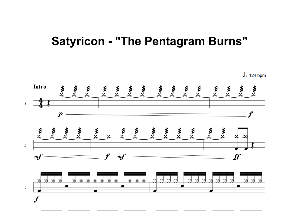 《The Pentagram Burns》是Satyricon演唱的一首歌曲,这份架子鼓谱共有九张高清图谱,图谱由 @举个例子 编配上传,图谱使用五线谱编配,使用这份The Pentagram Burns架子鼓谱,你将能够轻松地敲打出这首Satyricon的The Pentagram Burns,快来尝试吧。