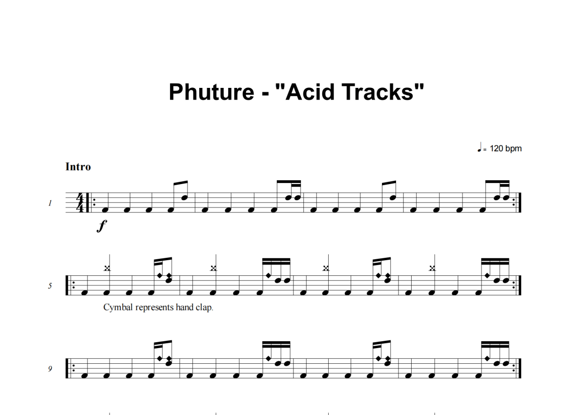 《Acid Tracks》是Phuture演唱的一首歌曲,这份架子鼓谱共有十一张高清图谱,图谱由 @举个例子 编配上传,图谱使用五线谱编配,使用这份Acid Tracks架子鼓谱,你将能够轻松地敲打出这首Phuture的Acid Tracks,快来尝试吧。