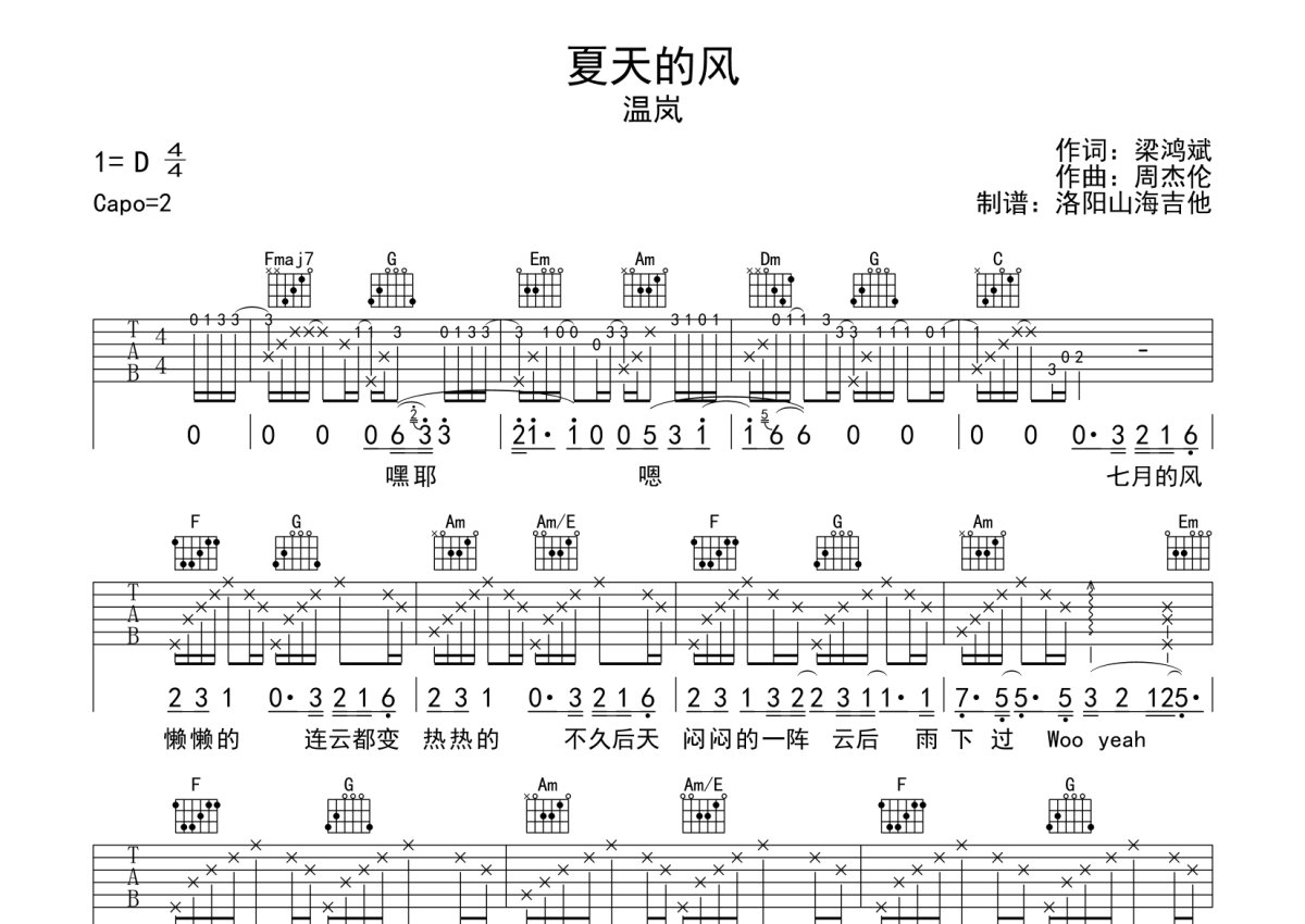 温岚《夏天的风》吉他谱 - C调弹唱六线谱