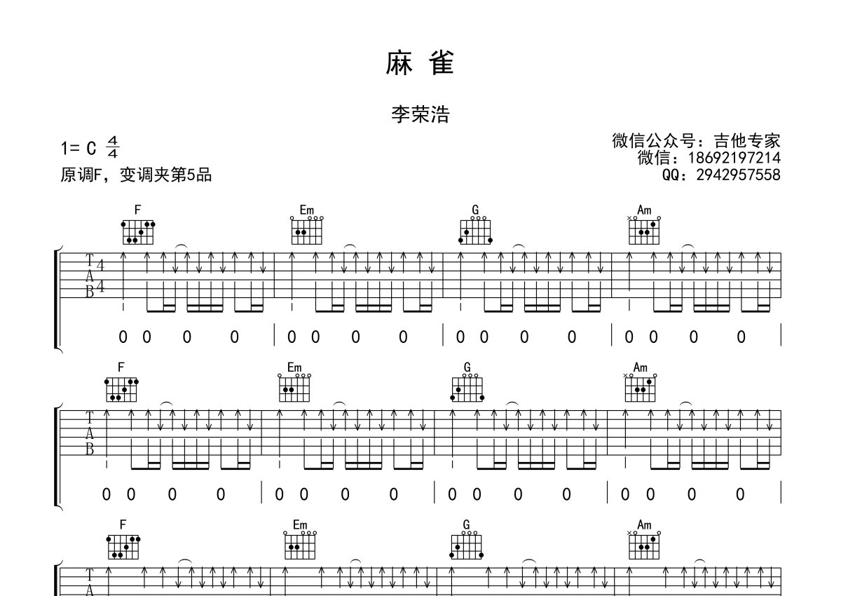 《麻雀》是李荣浩演唱的一首歌曲,本吉他谱采用的是C调指法编配,这份吉他谱共有两张高清图谱,图谱由 @吉他专家 编配上传,图谱使用六线谱编配,包含吉他和弦指法、简谱以及歌词部分,使用这份麻雀吉他谱,可以让你更加方便地掌握这首歌曲的弹唱技巧,快来尝试吧。原调F,变调夹夹五品,选用C调指法。