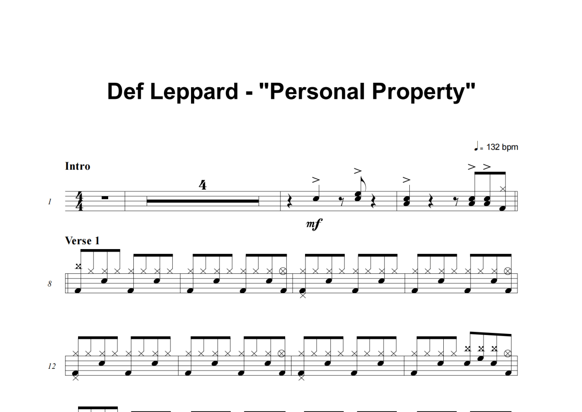 《Personal Property》是Def Leppard演唱的一首歌曲,这份架子鼓谱共有四张高清图谱,图谱由 @举个例子 编配上传,图谱使用五线谱编配,使用这份Personal Property架子鼓谱,你将能够轻松地敲打出这首Def Leppard的Personal Property,快来尝试吧。