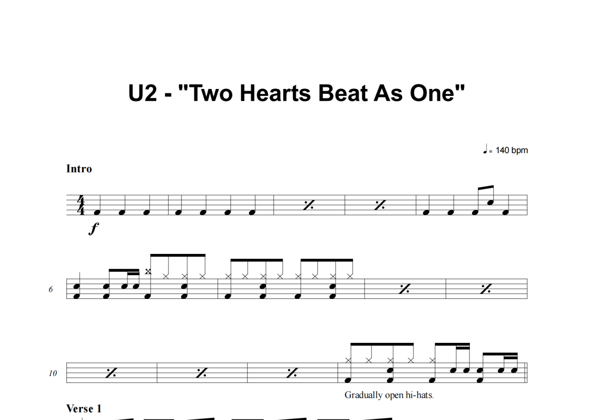 U2《Two Hearts Beat As One》架子鼓谱