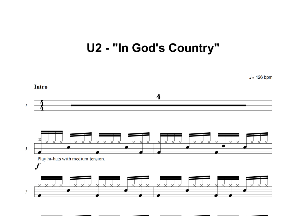 《In God's Country》是U2演唱的一首歌曲,这份架子鼓谱共有四张高清图谱,图谱由 @举个例子 编配上传,图谱使用五线谱编配,使用这份In God's Country架子鼓谱,你将能够轻松地敲打出这首U2的In God's Country,快来尝试吧。