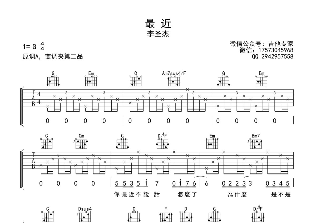 李圣杰《最近》吉他谱 - G调弹唱六线谱