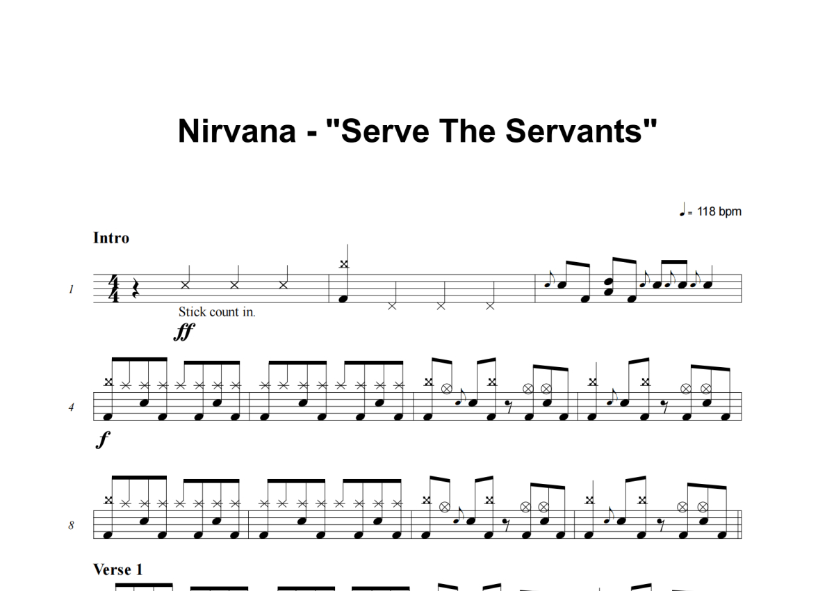 《Serve The Servants》是Nirvana演唱的一首歌曲,这份架子鼓谱共有四张高清图谱,图谱由 @举个例子 编配上传,图谱使用五线谱编配,使用这份Serve The Servants架子鼓谱,你将能够轻松地敲打出这首Nirvana的Serve The Servants,快来尝试吧。