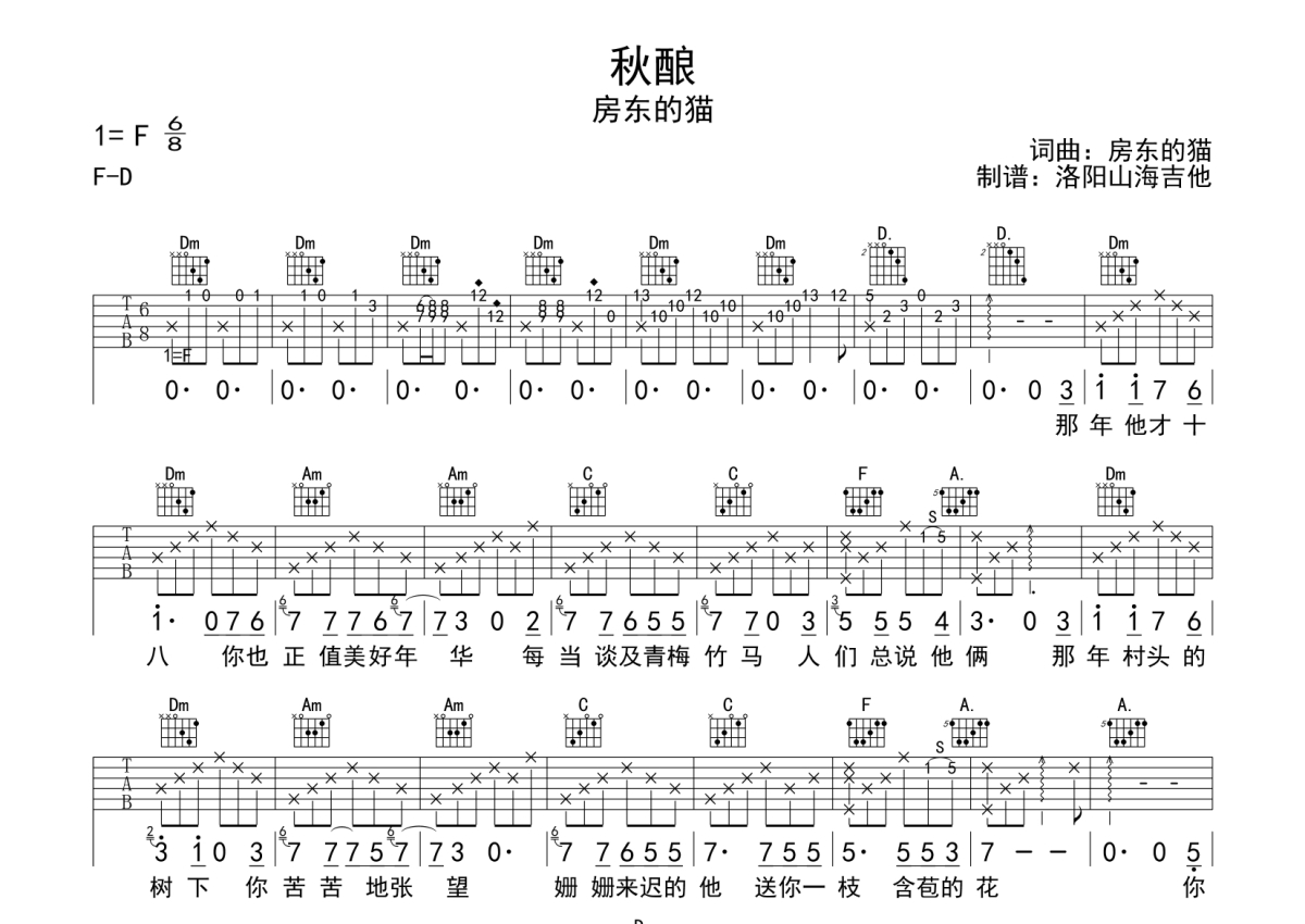 房东的猫《秋酿》吉他谱 - F调弹唱六线谱