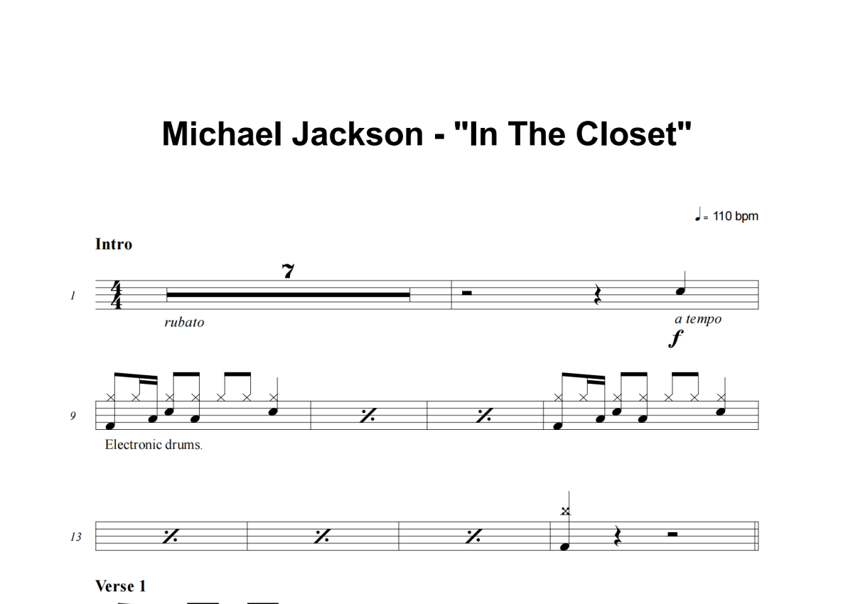 《In The Closet》是Michael Jackson演唱的一首歌曲,这份架子鼓谱共有四张高清图谱,图谱由 @举个例子 编配上传,图谱使用五线谱编配,使用这份In The Closet架子鼓谱,你将能够轻松地敲打出这首Michael Jackson的In The Closet,快来尝试吧。