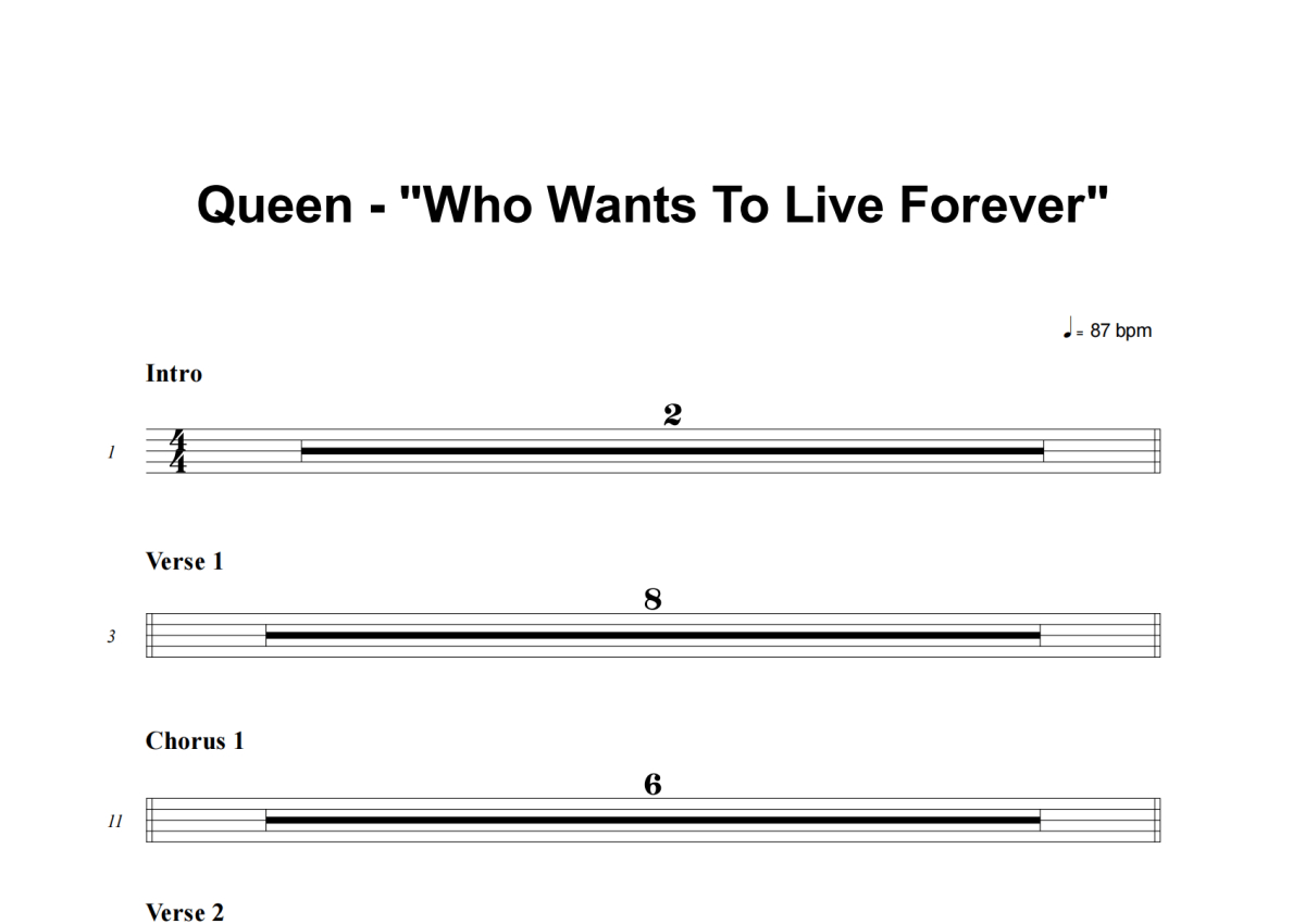 《Who Wants To Live Forever》是Queen演唱的一首歌曲,这份架子鼓谱共有两张高清图谱,图谱由 @举个例子 编配上传,图谱使用五线谱编配,使用这份Who Wants To Live Forever架子鼓谱,你将能够轻松地敲打出这首Queen的Who Wants To Live Forever,快来尝试吧。