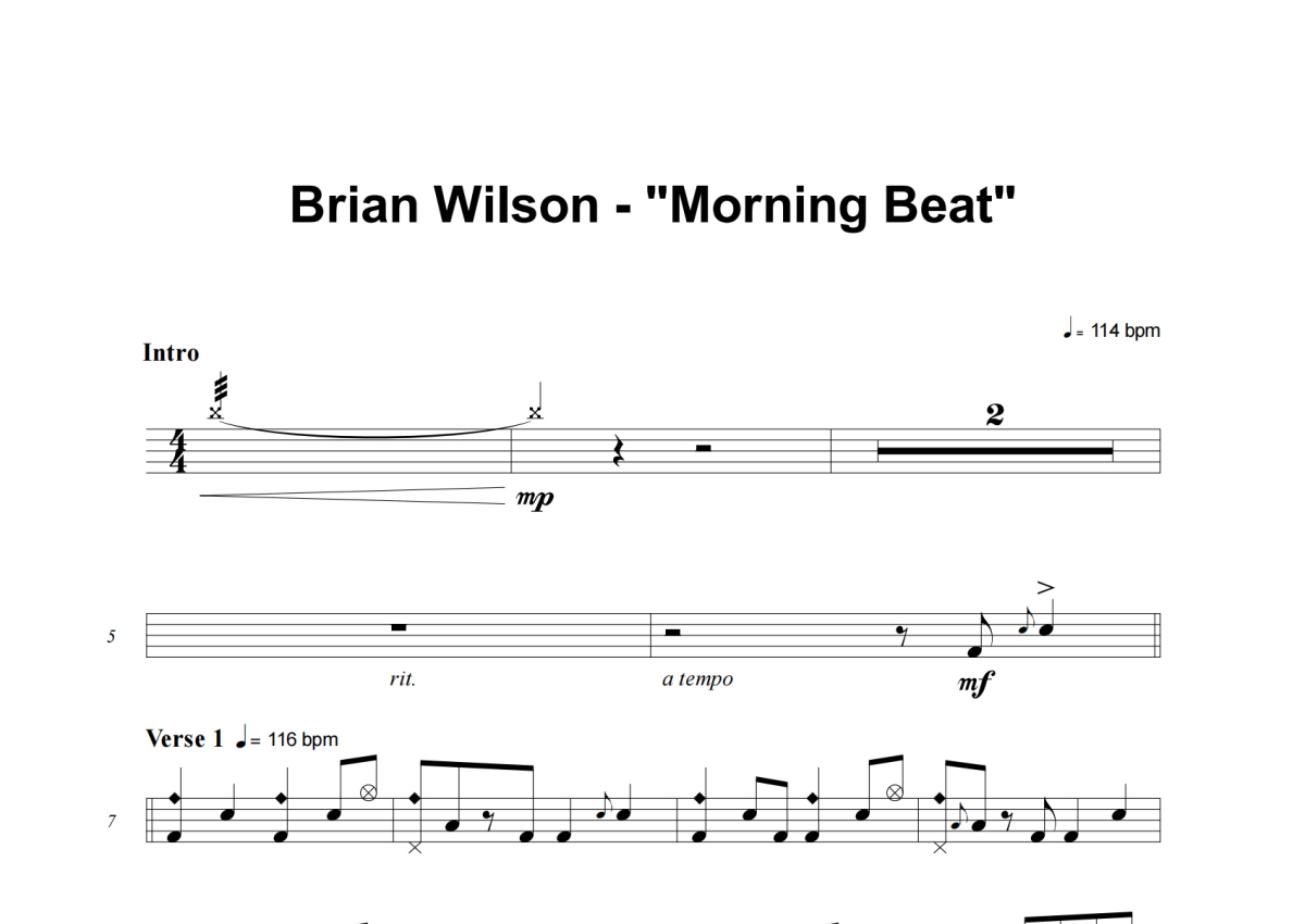 《Morning Beat》是Brian Wilson演唱的一首歌曲,这份架子鼓谱共有三张高清图谱,图谱由 @举个例子 编配上传,图谱使用五线谱编配,使用这份Morning Beat架子鼓谱,你将能够轻松地敲打出这首Brian Wilson的Morning Beat,快来尝试吧。
