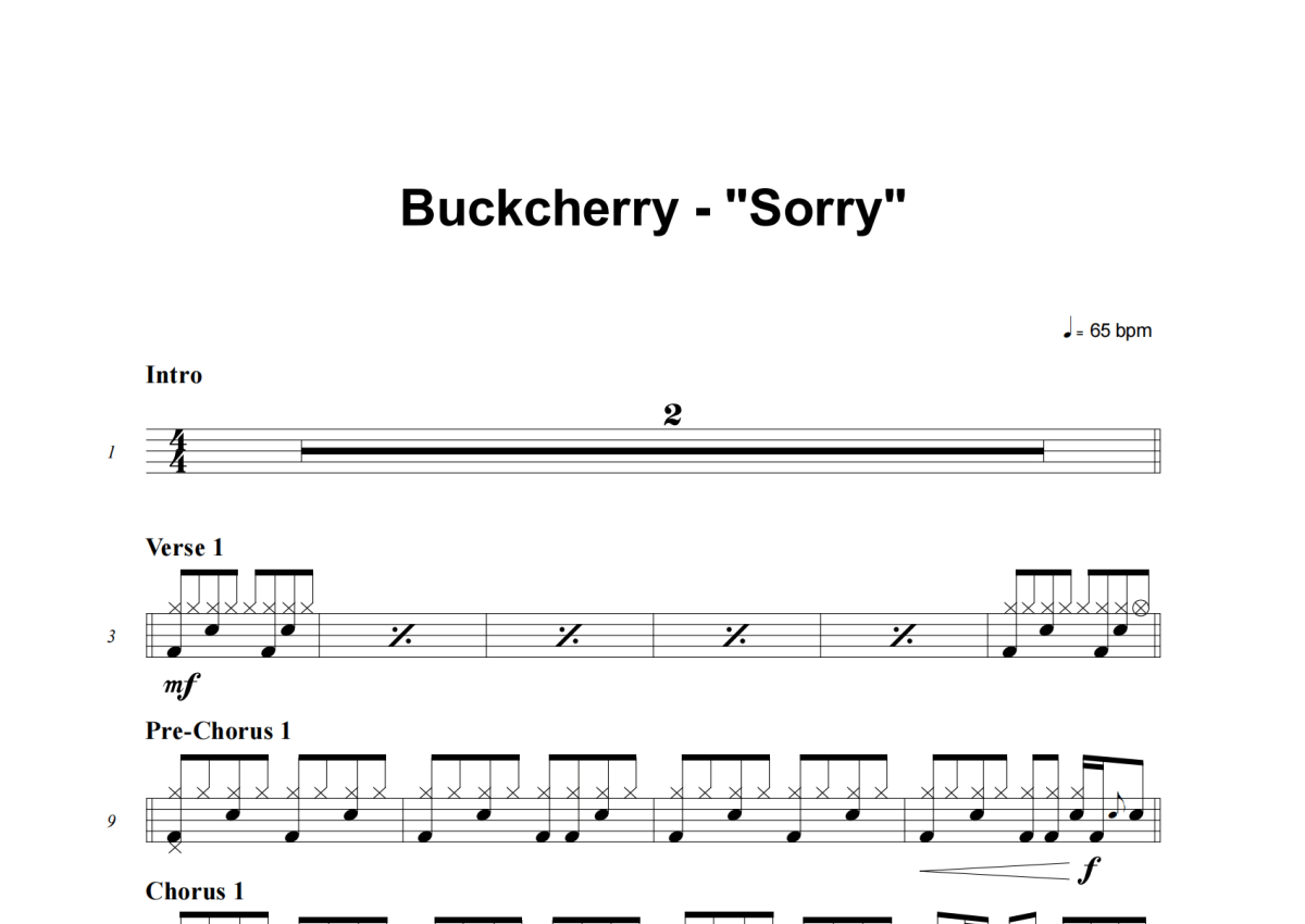 《Sorry》是Buckcherry演唱的一首歌曲,这份架子鼓谱共有两张高清图谱,图谱由 @举个例子 编配上传,图谱使用五线谱编配,使用这份Sorry架子鼓谱,你将能够轻松地敲打出这首Buckcherry的Sorry,快来尝试吧。