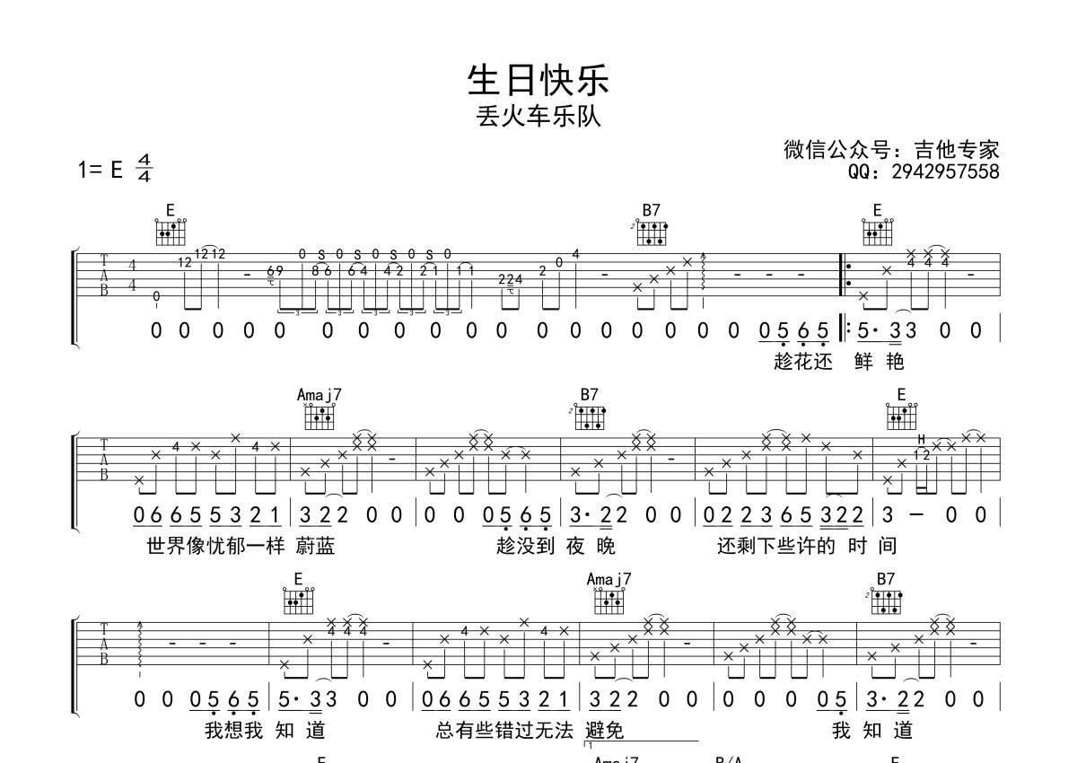 丢火车乐队《生日快乐》吉他谱 - E调弹唱六线谱