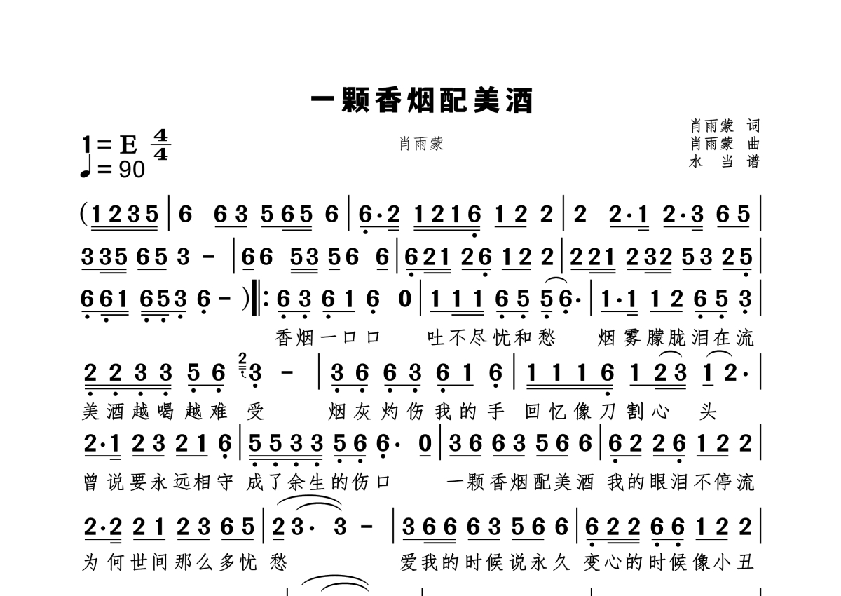 《一颗香烟配美酒》是肖雨蒙演唱的一首歌曲,拍号为4/4拍,歌曲速度为每分钟90拍,这份简谱共有一张高清图谱,图谱由 @水当 编配上传原调E。