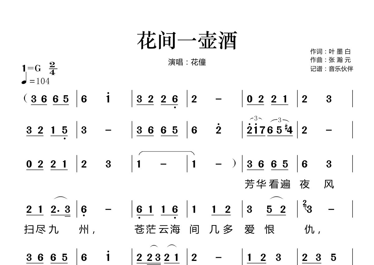 《花间一壶酒》是花僮演唱的一首歌曲,拍号为2/4拍,歌曲速度为每分钟104拍,这份简谱共有两张高清图谱,图谱由 @音乐伙伴 编配上传。