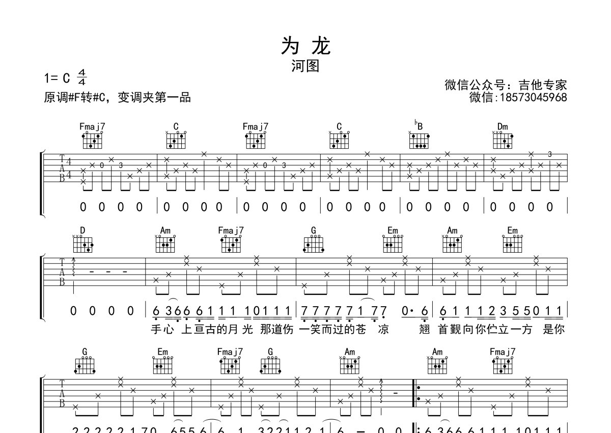 《为龙》是河图演唱的一首歌曲,本吉他谱采用的是C调指法编配,这份吉他谱共有两张高清图谱,图谱由 @吉他专家 编配上传,图谱使用六线谱编配,包含吉他和弦指法、简谱以及歌词部分,使用这份为龙吉他谱,可以让你更加方便地掌握这首歌曲的弹唱技巧,快来尝试吧。河图创作演唱的一首古风歌曲,为龙六线谱,原调升F转升C,(前奏升F调,主歌部分就换成了升C调,不好进唱!)变调夹夹一品,C调指法弹唱谱,很多人是因为这首歌曲入坑从此爱上河图的系列作品。五千年的辉煌历史,七十年的光辉岁月。十二章纹,红墙绿瓦,丹青汉字,铭刻着过去,书写着荣辱,千载过后,铅华洗净。谨记生而为龙的模样,谨记我的姓名是炎黄。
