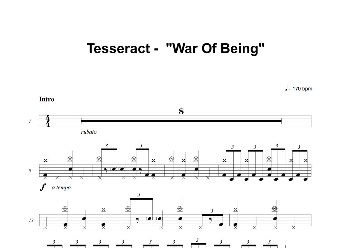 《War Of Being》是TesseracT演唱的一首歌曲,这份架子鼓谱共有十三张高清图谱,图谱由 @举个例子 编配上传,图谱使用五线谱编配,使用这份War Of Being架子鼓谱,你将能够轻松地敲打出这首TesseracT的War Of Being,快来尝试吧。