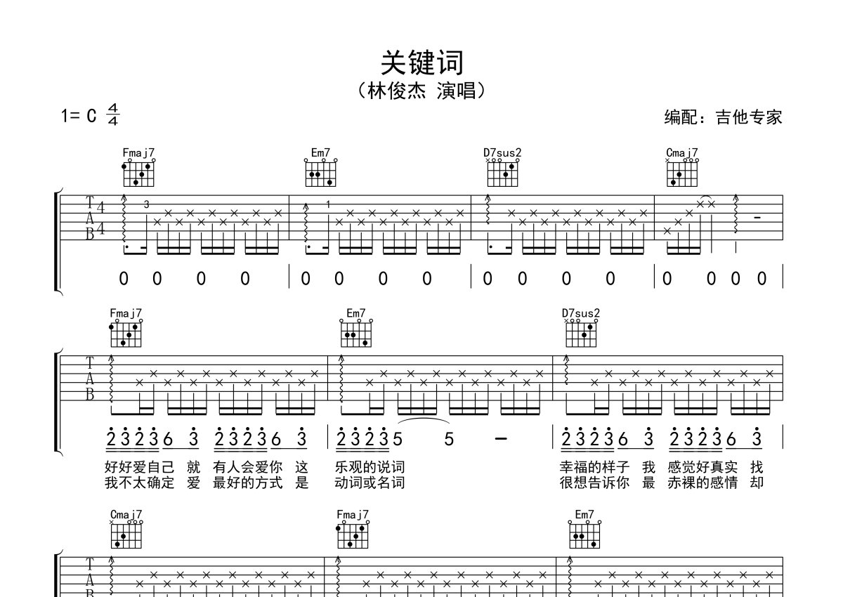 林俊杰《关键词》吉他谱 - C调弹唱六线谱