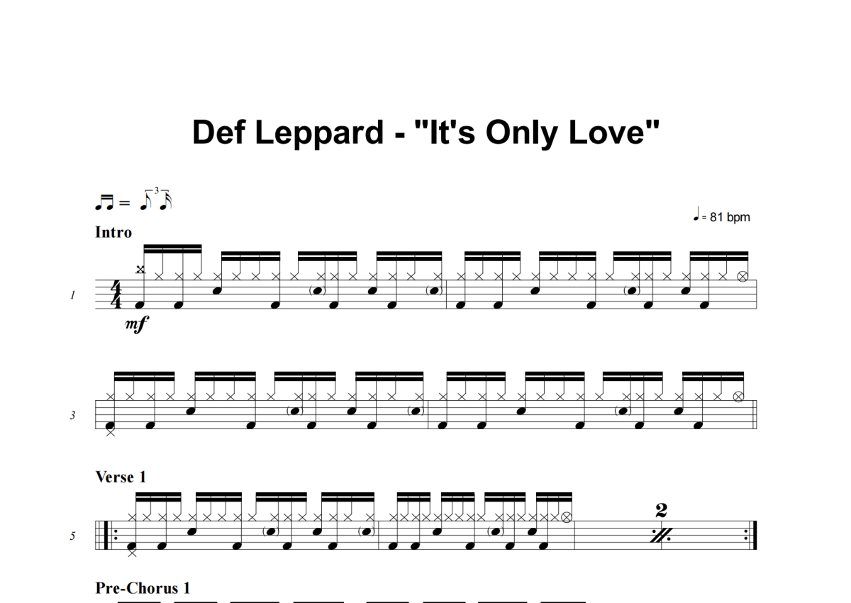 《It’s Only Love》是Def Leppard演唱的一首歌曲,这份架子鼓谱共有三张高清图谱,图谱由 @举个例子 编配上传,图谱使用五线谱编配,使用这份It’s Only Love架子鼓谱,你将能够轻松地敲打出这首Def Leppard的It’s Only Love,快来尝试吧。