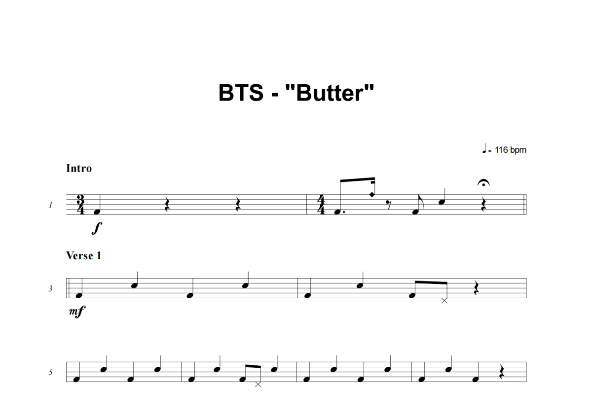 《Butter》是BTS演唱的一首歌曲,这份架子鼓谱共有三张高清图谱,图谱由 @举个例子 编配上传,图谱使用五线谱编配,使用这份Butter架子鼓谱,你将能够轻松地敲打出这首BTS的Butter,快来尝试吧。