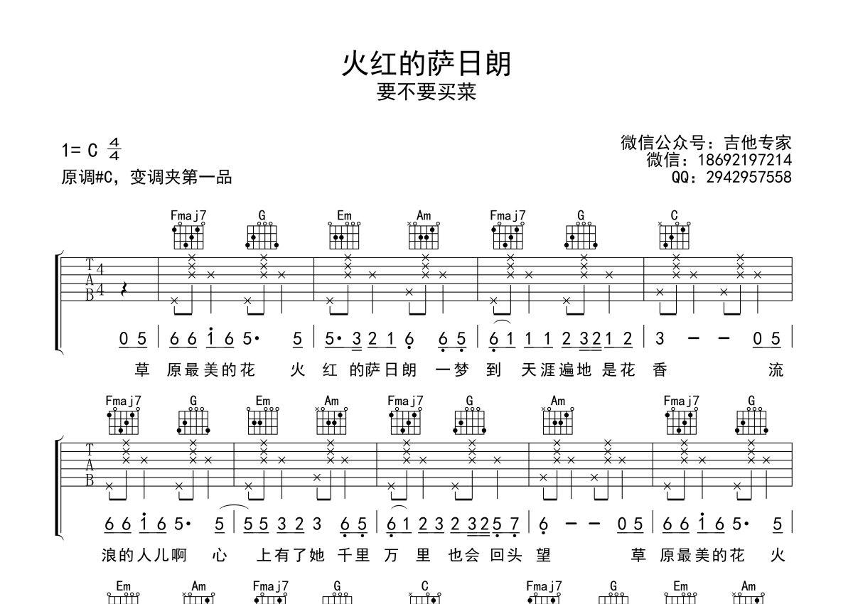 要不要买菜《火红的萨日朗》吉他谱 - C调弹唱六线谱