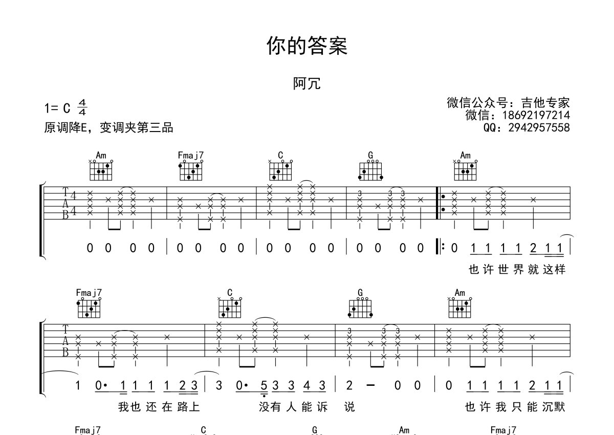 《你的答案》是阿冗演唱的一首歌曲,本吉他谱采用的是C调指法编配,这份吉他谱共有两张高清图谱,图谱由 @吉他专家 编配上传,图谱使用六线谱编配,包含吉他和弦指法、简谱以及歌词部分,使用这份你的答案吉他谱,可以让你更加方便地掌握这首歌曲的弹唱技巧,快来尝试吧。阿冗《你的答案》吉他谱_C调吉他弹唱谱。