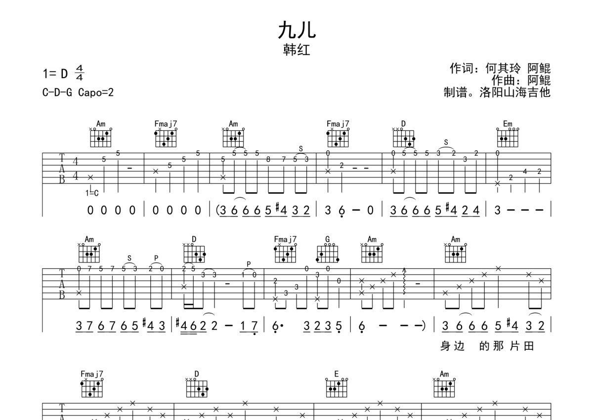 《九儿》是韩红演唱的一首歌曲,本吉他谱采用的是C调指法编配,这份吉他谱共有两张高清图谱,图谱由 @何奔洋 编配上传,图谱使用六线谱编配,包含吉他和弦指法、简谱以及歌词部分,曲谱配备了相关的音频提供试听,使用这份九儿吉他谱,可以让你更加方便地掌握这首歌曲的弹唱技巧,快来尝试吧。