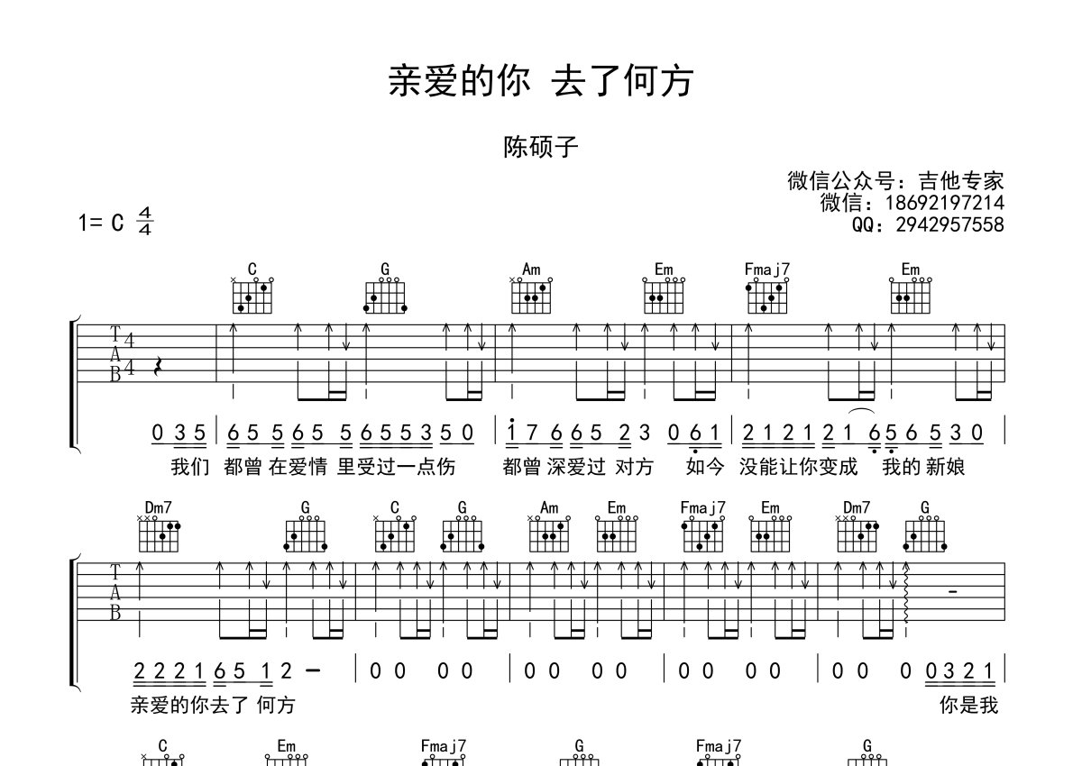 《亲爱的你去了何方》是陈硕子演唱的一首歌曲,本吉他谱采用的是C调指法编配,这份吉他谱共有两张高清图谱,图谱由 @吉他专家 编配上传,图谱使用六线谱编配,包含吉他和弦指法、简谱以及歌词部分,使用这份亲爱的你去了何方吉他谱,可以让你更加方便地掌握这首歌曲的弹唱技巧,快来尝试吧。《亲爱的你去了何方》吉他谱,陈硕子的一首原创歌曲,原调E,选调C,变调夹夹四品。亲爱的你去了何方六线谱,我们都曾在爱情里,受过一点伤。诸多的遗憾,绵绵缠绕每一个听懂的人。这首充满释怀的歌,是不是也是你想要的答案?。