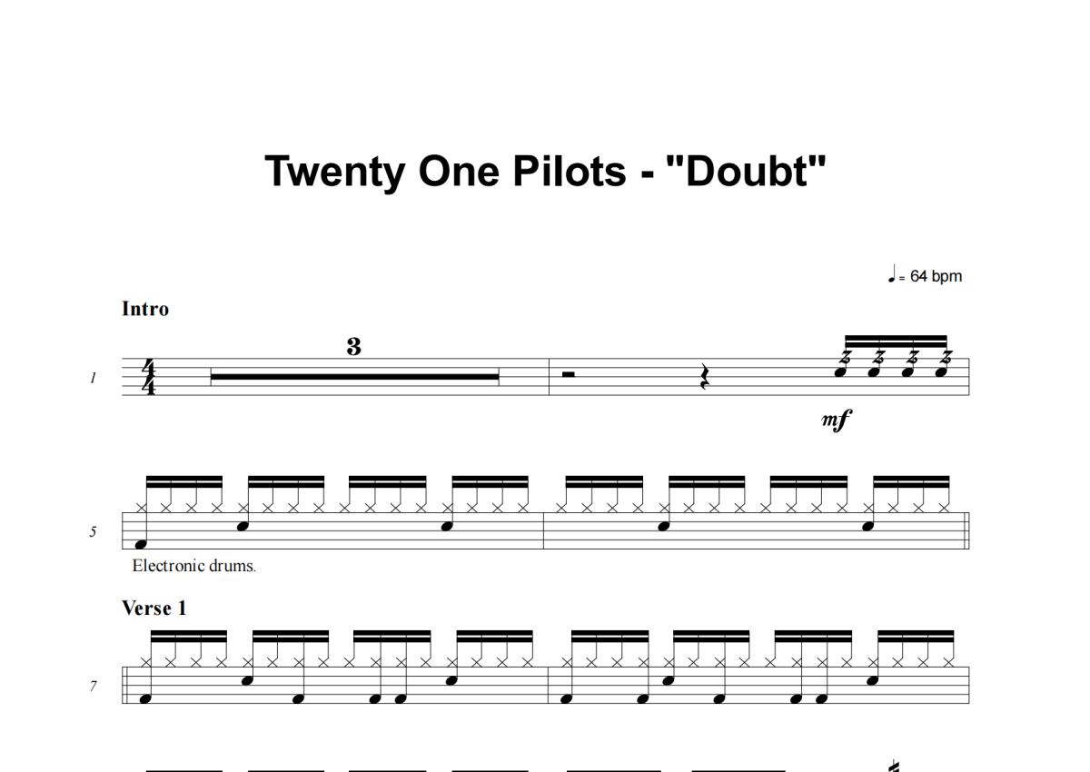 《Doubt》是Twenty One Pilots演唱的一首歌曲,这份架子鼓谱共有三张高清图谱,图谱由 @举个例子 编配上传,图谱使用五线谱编配,使用这份Doubt架子鼓谱,你将能够轻松地敲打出这首Twenty One Pilots的Doubt,快来尝试吧。