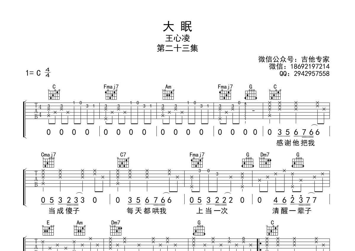 《大眠》是王心凌演唱的一首歌曲,本吉他谱采用的是C调指法编配,这份吉他谱共有两张高清图谱,图谱由 @吉他专家 编配上传,图谱使用六线谱编配,包含吉他和弦指法、简谱以及歌词部分,使用这份大眠吉他谱,可以让你更加方便地掌握这首歌曲的弹唱技巧,快来尝试吧。《大眠》吉他谱,王心凌演唱的一首虐心情歌,最近在各大视频音乐平台火了起来。大眠六线谱,原调E,变调夹夹第四品,选用C调指法。在爱情里,我们像一个傻子,流过泪,受过伤,才知道天长地久不过一场梦境。愿每一个在青春里迷失的人,在听过这首歌曲后,都能大眠初醒,再次回忆起失去的,相遇的,和自己和解。……。