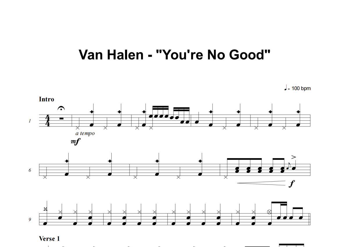 《You're No Good》是Van Halen演唱的一首歌曲,这份架子鼓谱共有三张高清图谱,图谱由 @举个例子 编配上传,图谱使用五线谱编配,使用这份You're No Good架子鼓谱,你将能够轻松地敲打出这首Van Halen的You're No Good,快来尝试吧。