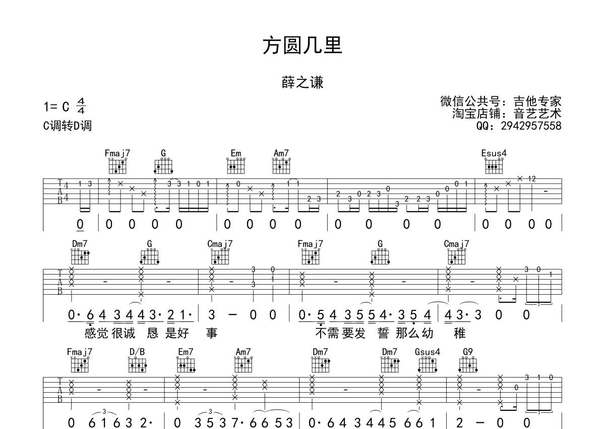 《方圆几里》是薛之谦演唱的一首歌曲,本吉他谱采用的是C调指法编配,这份吉他谱共有两张高清图谱,图谱由 @吉他专家 编配上传,图谱使用六线谱编配,包含吉他和弦指法、简谱以及歌词部分,使用这份方圆几里吉他谱,可以让你更加方便地掌握这首歌曲的弹唱技巧,快来尝试吧。薛之谦方圆几里吉他谱,C调转D调,方圆几里六线谱,艺音吉他弹唱教学系列,薛之谦歌曲图片谱。薛之谦《方圆几里》吉他版「因为我爱你,和你没关系。」这是一首旋律很温柔也很伤感的歌,薛之谦的声音很深情很适合悲情。相比于原伴奏中深沉的悲伤感觉吉他弹唱多了一些随意和释然,一个人的时候就不会觉得寂寞。只要你转身,我就在这里。每个人都有一个卑微等待的人。