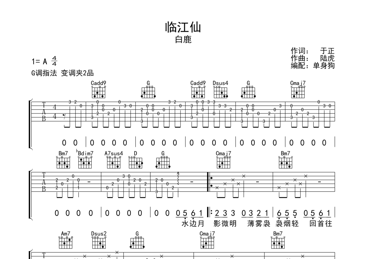 临江仙吉他谱 - 白鹿演唱 - G调弹唱六线谱